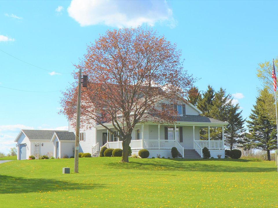 COUNTRY LIVING!! Great location for this completely renovated 2, 208 sq. ft. farmhouse in impeccable condition situated on 2.88 acres. Enjoy the view of the nicely landscaped yard from the full wrap around porch. Updated entry with plenty of storage leads to the open living room and country kitchen with new wood floors and island. 6 bedrooms, 2.5 baths, first floor laundry and an additional family room/kitchen upstairs. Maintenance free exterior and numerous updates including roofs, windows, siding, furnace and well. Home could also easily be converted back to a 2 family for additional income. Includes a 42 x 60 heated and cooled steel structure and an additional heated 40 x 60 steel structure which is currently a successful auto repair business.