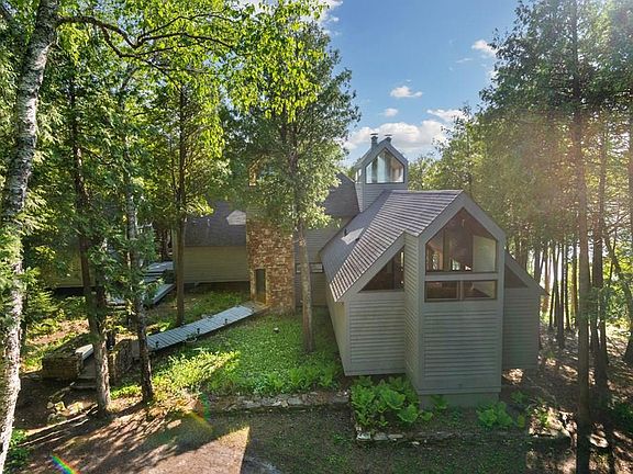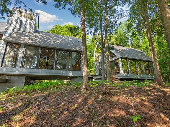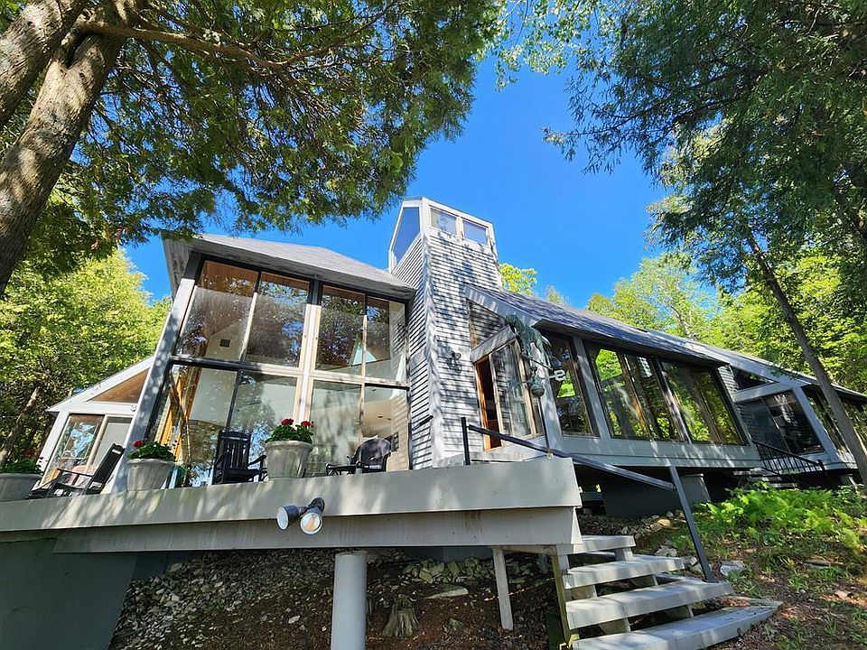 Tucked in the woods on the bluff sits this custom-built, architecturally-designed home with westerly water views of Green Bay. The unique design consists of 4 “pods” – main bedroom, living room, dining room/kitchen & guest house. The living room features soaring double-height windows which bring the outside in, a fieldstone fireplace & a floating staircase to the loft bedroom, which has a tower room above. Throughout the home you will find beautiful wood flooring & built-ins. The guest quarters are steps away from the main home, and offer built-in bunks, a bedroom, full bath, and living room. There is 149' of shorefront below the bluff, and a detached two-car garage for your toys. Enjoy entertaining family & friends in this amazing home!