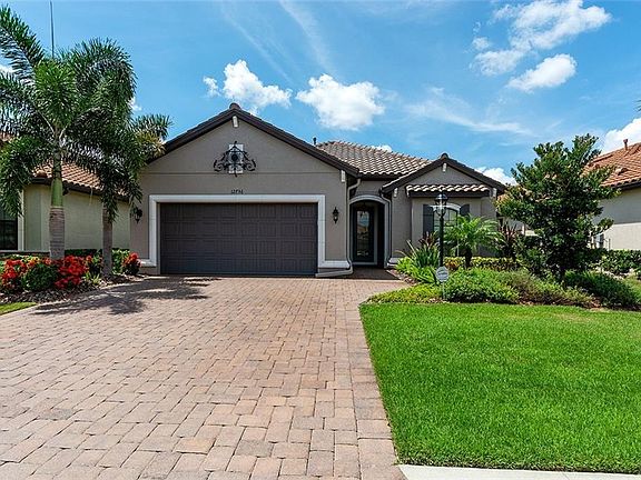 This lovely home has one of the best lots in Esplanade. The large lanai is made for entertaining with an outdoor kitchen, fireplace, and remote controlled hurricane shutters that can keep the weather out or provide security. The gourmet kitchen has high-end, white linen cabinets, stainless appliances with drop-in gas range, faux painted backsplash, customized walk-in pantry, and granite countertops. The enormous kitchen island has storage all around it and is a show-stopper! The generously sized owner's retreat has an en-suite bathroom with a large roman shower, dual sinks, and customized walk-in closet with an island! Notable upgrades include barn doors on the den, surround sound and intercom system, central vacuum, and custom window treatments. In the whole house there is custom crown molding. Wood like floors through the whole house. Esplanade has so much to offer but NO GOLF MEMBERSHIP is required so fees stay low. As one of Lakewood Ranch's top resort communities the amenities include a full-time Activity Director, 2 fitness centers, spa and salon, lagoon style pool, resistance pool, pickle ball courts, bocce ball courts, dog parks, and tennis courts. The tiki bar is a casual dining restaurant overlooking the infinity edge pool with cabanas giving you the feel of a high end resort. A newly built restaurant overlooking the golf course was completed in 2018. This restaurant will also house a culinary arts center. Esplanade is located just minutes from I-75, for a quick commute to Sarasota, University Mall, & Tampa Airport. Don't miss this lovely newer home!