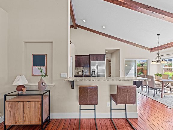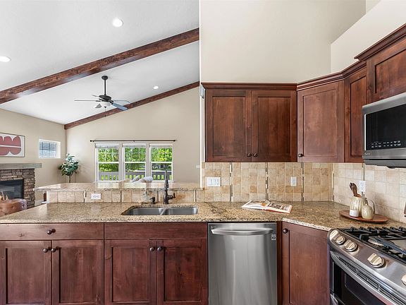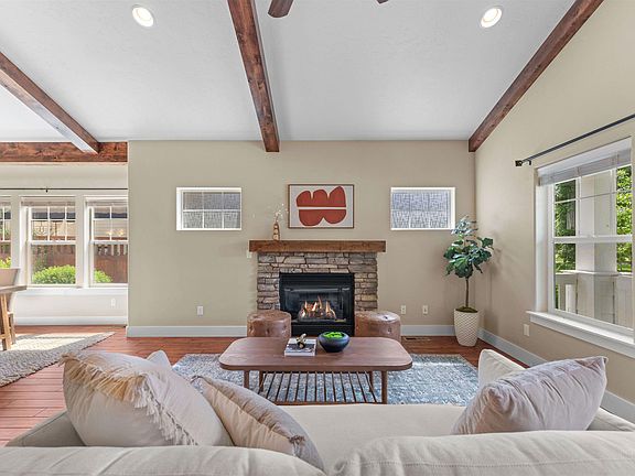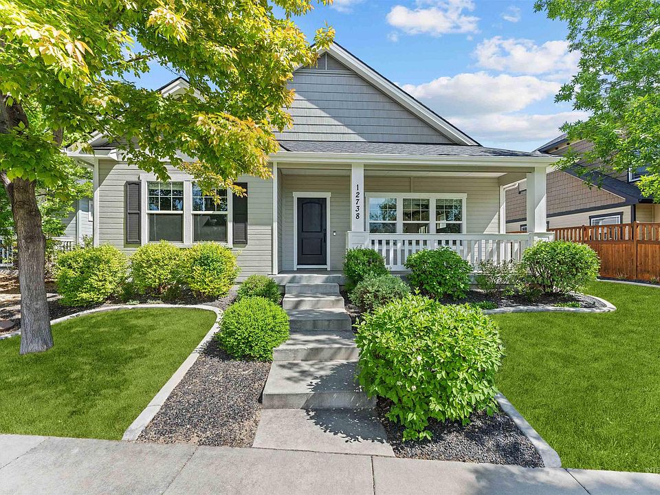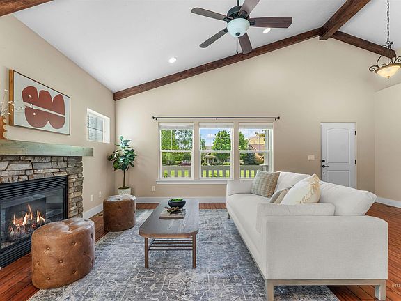 Stunning residence with low maintenance living situated on a quiet street in coveted Hidden Springs. Inviting front porch welcomes you into this beautiful home that is showcased by vaulted ceilings with custom beams, cozy stone fireplace, sprawling maple hardwood floors and an abundance of natural light. Flexible floor plan- nearly 2500sf, 4 spacious bedrooms, 3 full bathrooms plus oversized bonus room that is great for entertaining. Gourmet kitchen features breakfast bar, custom cabinetry, granite countertops, stainless appliances, eating space and pantry for storage. Main level owners suite boasts tray ceilings, dual vanity, travertine tile, soaker tub, tile shower and walk-in closet. Escape upstairs to a spacious bedroom, large bonus room plus full bathroom. 2 car garage w/ extra storage space for your toys. Excellent indoor/outdoor entertaining- fully fenced, patio, mature trees & lush landscaping. Hidden Springs is an amazing community that offers clubhouse, two pools, hiking/biking trails & events!