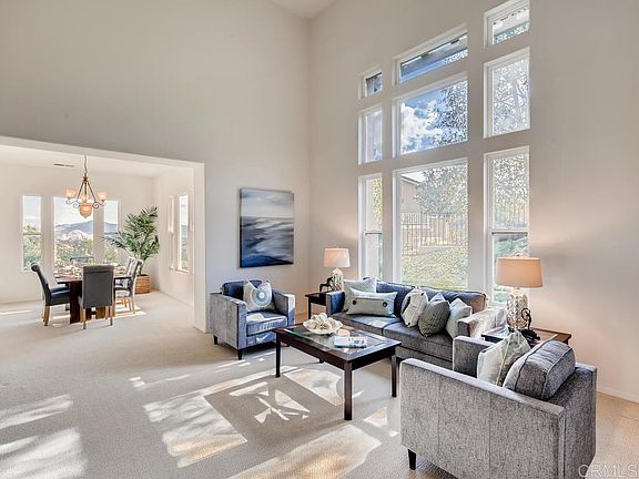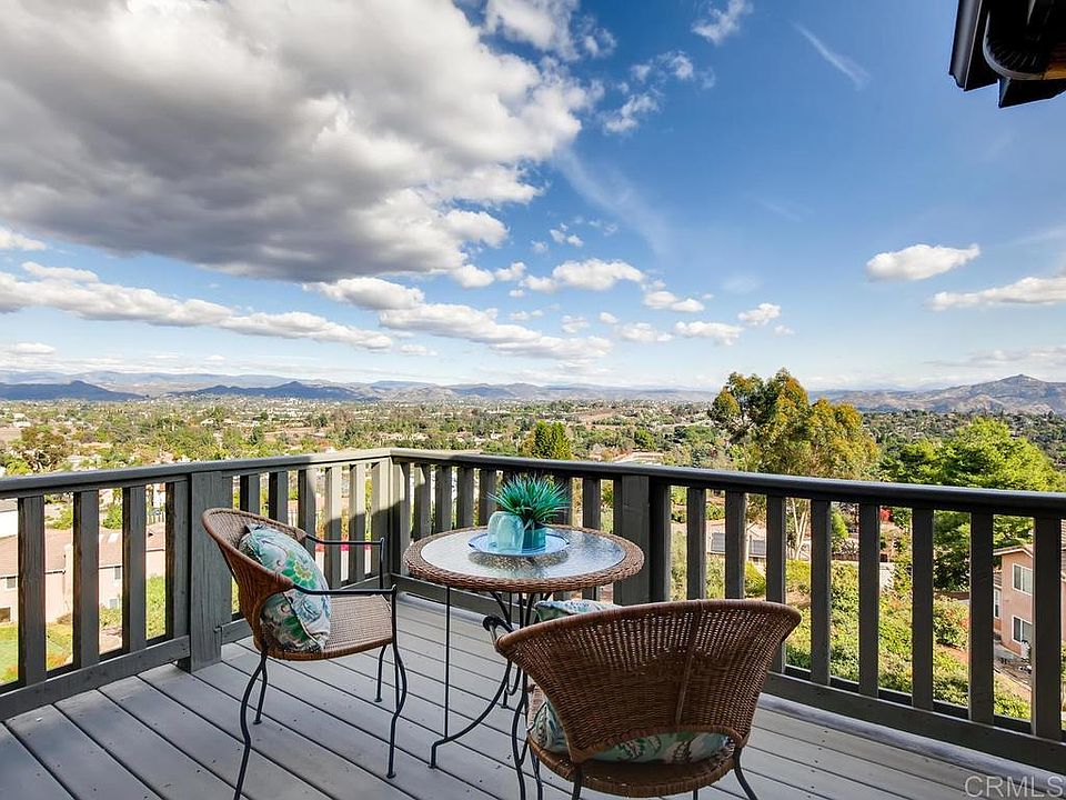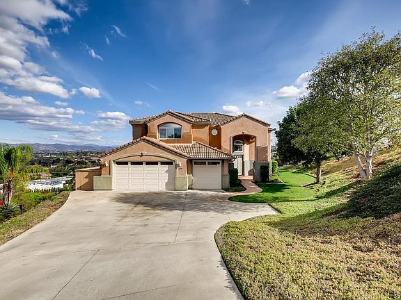 Stunning panoramic views from a prime location in Southwest Escondido. The moment you enter, the soaring ceilings and high windows create a home filled with natural light. Entertain with views, from the living room flowing into the dining area. Prepare meals in the gourmet kitchen, with granite counters and island opening onto the family room, where you can cozy by the fireplace. Start your day with coffee and sunrise over the mountains from the master suite sitting area or private balcony. *Owned Solar* You will find custom radius wall corners and recessed lighting throughout. Have guests stay in the bedroom with full bathroom on the entry level. The kitchen has beautiful tile flooring and a huge walk-in pantry. Double doors open to the luxurious master bedroom suite, with skylights, jacuzzi tub, private balcony and a spacious walk-in closet. The laundry room is located inside and has plenty of storage and a sink. Convenient second floor office loft or use as a play area for the kids. The entire home is wired for an alarm system and central vacuum. Three car garage with epoxy flooring, built-in cabinets and 220 volt for your electric car. *The solar system is fully owned and only 1 year new* The manicured, easy maintenance yard has automatic sprinklers. The private drive and lay out, offer a feeling of seclusion and serenity, but close to all. Walking distance to schools. Minutes to The California Center for the Arts, San Diego Zoo Safari Park and North County Fair Mall. No Mello-Roos or HOAs. Live the California Lifestyle, in a prime hilltop location, looking out to spectacular panoramic views of the mountains and valley!