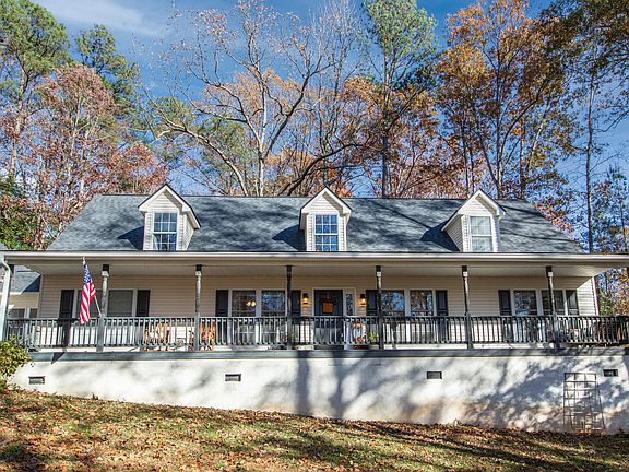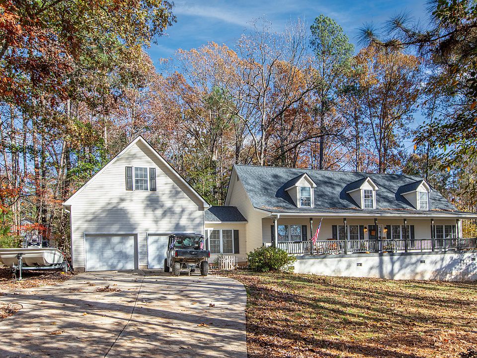 Enjoy quietness & privacy on your rocking-chair front porch & the serenity of living on a DOUBLE LOT across from the LAKE! If adventure is more your style there is boating, swimming and fishing galore with the Lake Royale amenities. This home has a spacious OPEN FLOOR PLAN and is a RANCH-style home with a walk up UNFINISHED SECCOND FLOOR and plumbed for an additional bath! The kitchen features GRANITE counter tops, STAINLESS appliances and tons of BRIGHT NATURAL LIGHT. PRIMARY SUITE on the MAIN FLOOR, fourth bedroom can be used as a DEDICATED OFFICE and there is a WORKSHOP above garage! NEW ROOF in 2023