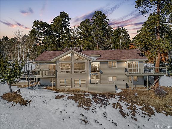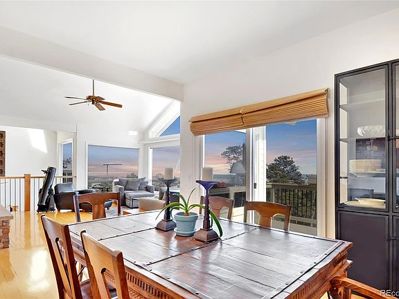 Mountain Contemporary home with main floor master and stunning Denver Skyline Views!! The living room features floor to ceiling stone fireplace, open shelves, expansive wall of windows framing the views plus vaulted ceilings, creating a chic, clean finish that is light and bright. Lovely dining room perfect for entertaining. The chef will appreciate this well-appointed kitchen, with maple cabinets and flooring, sleek honed granite countertops, and a brick accent wall featuring a wood-burning stove. Spacious master bedroom with private deck, spa-like bathroom, and custom walk-in closet. The walkout family room is perfect for more casual gatherings. The wood-burning stove provides ambiance and warmth, or for some fresh Colorado, air enjoy direct access to the patio space. Situated off the family room is a great bonus space that would make a perfect game or craft room. Another ample flex space could make an ideal home office. Fabulous outdoor living spaces to enjoy the views and wildlife. Genesee offers 11 miles of hiking trails, 1200 acres of open space, 2 pools, 4 tennis courts & award-winning schools. Plus 25-minute drive to downtown Denver. 60-minutes to world-class ski resorts. This is what foothills living is all about!