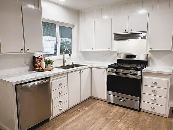 Fully Remodeled, VERY Low Space Rent ($760) and No Property Taxes! Double pane windows. Stunning kitchen with new stainless appliances and beautiful new white cabinetry. Spacious Living Room with vaulted ceiling. Recessed lighting. New flooring throughout. Two bedrooms and two full baths. Laundry Room. Freshly painted inside and out. Located in a quiet and private back corner of the highly desirable Georgian Manor Mobile Home Community. Lots of guest parking near home. Buyer must be 55 years or older to qualify for the park. Space rent is $760.