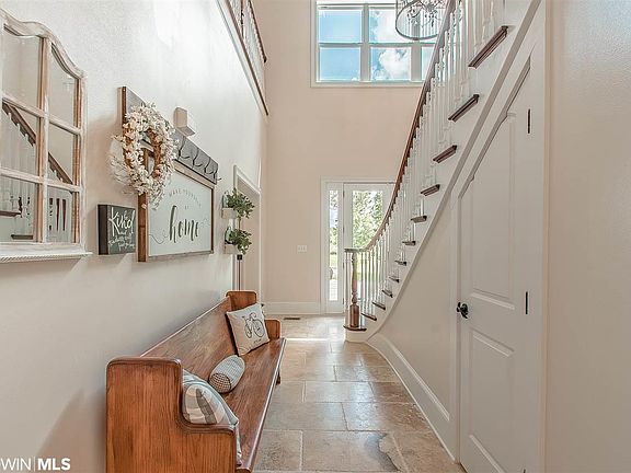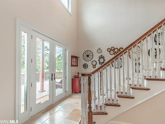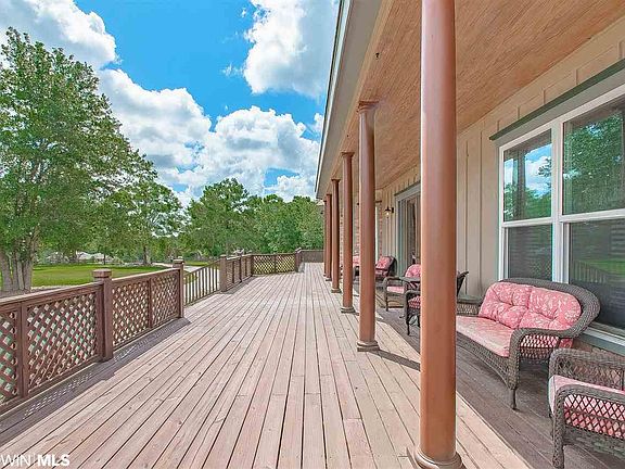 A quiet sanctuary on a sprawling estate in Fairhope just minutes from Weeks Bay! Upon entering the gated drive you are welcomed by the lush fenced almost 10 acres with mature Pecan, Oak, and Apple trees. Beautifully landscaped and overlooking the Dominion Farms stocked pond, this property is unlike any other. The Custom house boasts over 3000 sq ft of wrap-around porches and includes a cross-fenced side yard. This Luxury home is quite unique with Creative styles and finishes throughout. The sweeping staircase and two story foyer create a Grand entryway. You will be drawn in by the 10' ceilings with crown molding, an abundance of windows and Travertine tile floors in the main spaces. The pristine Game Room, Home Theater, and Personal Gym will all remain furnished for the new owners. With two fully-equipped Chef's Kitchens including ample counter and cabinet space, the possibilities are endless. The over-sized dining room with bay windows enjoys the view of the spacious backyard. Both Master Suites on the main level access the wrap around porches. One suite includes a fireplace and . All of the spacious bedrooms have their own bathrooms with double vanities and tub. The over 1000 sq ft 3 Car Detached Garage provides extra storage space as well as potential for a workshop area. Above the garage you will find 700 sq ft of Gym space with equipment, free weights, and television (not included in sq footage). Not in need of two kitchens? No worries! $20,000 renovation allowance offered! This home is the perfect venue for hosting friends and family, schedule your private tour today!