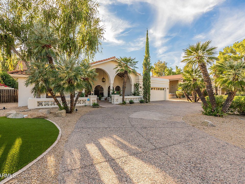 STUNNING 4 bed 2.5 ba home in DESIRABLE Buenavante in N Scottsdale w/ NO HOA! Great curb appeal w/ lush desert landscaping, turf yard, circular drive, and covered front porch entry. Enter to the great room w/ dramatic vaulted ceiling featuring exposed beams & cozy fireplace + formal dining for family gatherings. Kitchen features plenty of cabinet space + pantry, top of the line SS appliances, granite counters & backsplash, & flows to dining nook & family room, perfect for entertaining! Split master suite w/ French door exit to backyard, fireplace, and bath w/ dual vanity, separate shower & soaking tub, and walk-in closet. Spacious secondary bedrooms. Fresh paint inside & out, newer roof (2013), NEW water heater (2017), & NEW landscape watering system (2017). BEAUTIFUL resort style backyard offers expansive covered patio, sparkling saltwater pebble tec pool & in-ground spa, built-in BBQ & fireplace w/ underground propane tank, and gazebo. Great location with easy freeway access and minutes to Kierland and Scottsdale Quarter for shopping & dining.