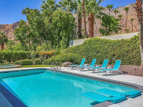 Popular Vista Las Palmas neighborhood Alexander built home. Designed by Charles DuBois in 1960. Thoroughly updated in 2015, including all HVAC and UV double paned windows and sliders. Tongue and groove ceilings throughout. Quartz counters in the custom white kitchen. Lots of storage. Tile in hall, kitchen, bathrooms, master bedroom and one guest bedroom with completely updated bathrooms. Large living room with floating Heath Tile fireplace and views of the pool and mountains as well as a spacious media room off the kitchen. West facing back yard with those desired mountain views. Sparkling pool, in ground spa and plenty of decking to enjoy the outdoor lifestyle with two covered patios for shade.Secluded and quiet location around the corner of the Elvis Presley honeymoon home.