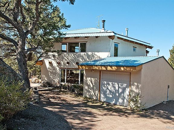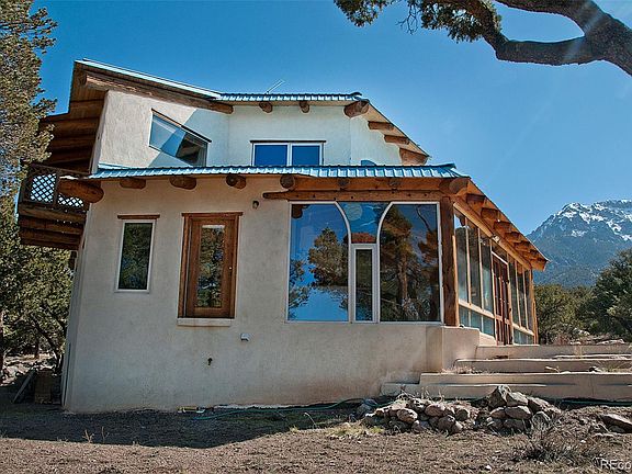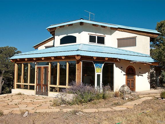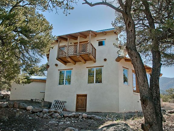 1-of-a-kind 1860sf 2BD/2BA custom home w/ great views & best Chalet 1 location: secluded cul-de-sac high up, backing to Willow Creek greenbelt. Includes solarium, garage & guest house. Guest house is 450sf w/ studio sleeping, full bath & kitchenette. Main home is hexagonal, constructed w/ Rastra block ICFs: reinforced concrete featuring superior residential structural/insulation properties. Includes extra lot for a total of 2 acres. Entering large, open-concept great room, one immediately notices the hand-set vigas and support posts, T&G ceilings, and many other wood, stone and plaster accents. Bathed in light, the south-facing solarium has floor-to-ceiling windows, stained-glass accents, & 9' French doors opening to flagstone terrace. A cozy sitting area faces a stone hearth & wood stove. The spacious open kitchen overlooks the dining area & solarium, w/ custom tile-counters, stainless appliances & wonderful views into the surrounding forest & across the valley. Brick, radiant-heated floors downstairs, along w/ passive solar gain & wood stove provide several options for maintaining comfortable temperature during winter. Kitchen/great room has convenient access to garage, via utility room w/ washer/dryer. Main level also has a bedroom & custom-tiled bath. Upstairs, the primary suite encompasses entire second floor, w/ meditation loft & sitting/library area that opens onto west-facing balcony - sweeping views to the San Juan Mtns, 60 miles away. The primary bath features custom-tile bath w/ jetted soaking tub. Across driveway is the guest house, featuring new composite walkway & deck. There is full bath, kitchenette w/ bar fridge, sleeping area, & tile floors. Bear Grass Way is a cul-de-sac abutting Willow Creek greenbelt, well-treed & private. Crestone, an accredited Int'l Dark Skies Community, is only 10 min by car - gas, groceries, mail, cafe, restaurant, brewery, hardware, gallery. Rare opportunity: artistic main home + guest house. Call now for details!