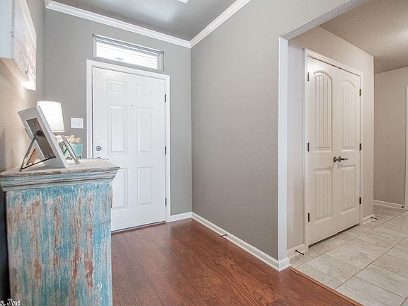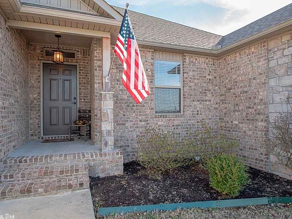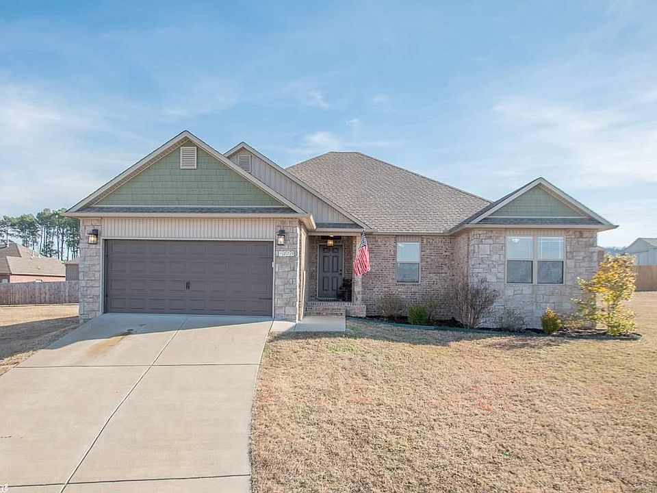 Located on a cul-de-sac & elevated slightly offering a view of the distant rolling hills. The exterior impresses with the brick, stone, and shake & shingle siding facade and the large side yards. The living area is open with large windows. The kitchen has stainless appliances, solid wood cabinets, & large pantry. Master suite has a generous walk-in closet, split vanities, & private water closet. Granite counters throughout. This home has years remaining on a transferable 2-10 home warranty.