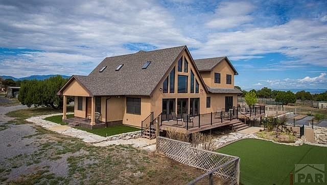Truly one of a kind custom home on nearly 80 acres of picturesque views of Lake Pueblo and the surrounding ranges from Pikes Peak to the Spanish Peaks.The recent custom renovation has all the amenities: all 3 spacious bedrooms have en-suite bath, whole house water treatment with hot water recirculation, central vac, surround sound, hardwood, tile and stamped concrete floors.Magnificent granite is the focal point in the open kitchen with custom cabinets, stainless appliances and 2 sinks.The loft office overlooks the living room which opens onto the massive composite deck leading to the artificial lawn surrounded by fruit trees, raspberries, grapes, garden beds and herb garden.The large basement family room is built with entertainment in mind, custom cabinetry, wiring, speakers and access to