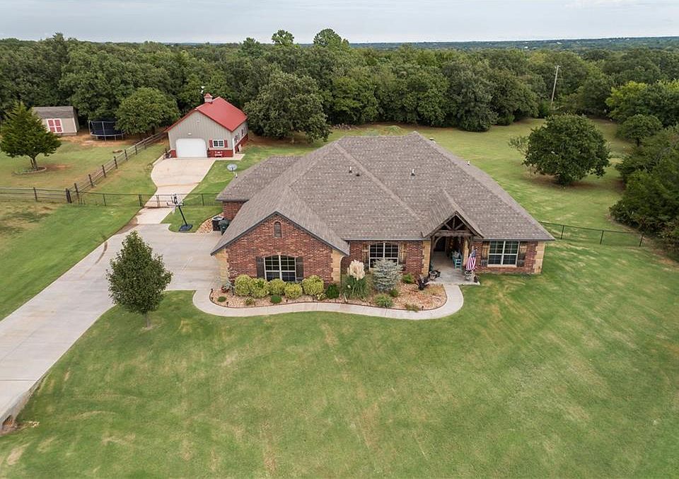 Gorgeous home on scenic lot! 1.52 Acres MOL, insulated metal shop, concrete pool w/water fall, storm shelter, & outdoor fire pit. True 5 bedroom home. 5th room is extra large and can also serve as a bonus/theater room. Large kitchen has SS appliances, 5 burner gas range w/double oven, granite counters, and tons of cabinet space! Open to dining room and living room. Living area features a beautiful wood-burning fireplace. Large master suite w/double vanities, walk-in closet, and jetted tub. Spacious laundry room with extra storage space. Great covered patio is perfect for entertaining.