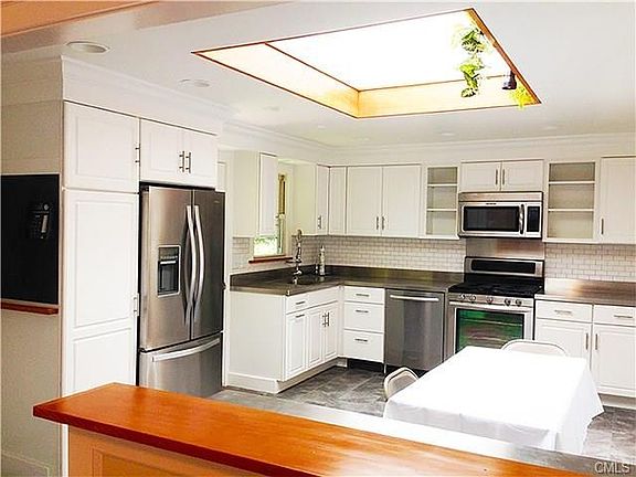 This is an amazingly rebuilt Stratford home, designed to please! You will love the stylish custom crown moldings and trim throughout, closets with automatic lighting, skylights with automated shades and motorized living room picture window blind, a wall of built-in cabinets with custom space to fit up to a 70" TV, wired for 7.1 channel surround sound, and ceiling speakers, multiple CATV and broad band wiring throughout, phone outlets on most walls. The bathroom is well lit with a skylight, window, wainscoting, custom medicine cabinetry, and beautiful marble surrounds the walls in the tub and shower. There is CA, gas heating, all newer appliances, and new furnace. The laundry room offers W/D, it is also set up for a home office, work out area, hobbies, extra refrigerator, cabinets, stainless steel counters, cedar closets for off season clothing and ready for a TV! The garage is sheet rocked and painted, rafter storage and electric outlets with rear door to the gorgeous fenced in yard with tall graceful shade trees and terrace! Lots of privacy, plenty of room for gardening or simply enjoying the quiet and peaceful yard. This is a very special and economical home to run PLUS easy commute to NYC. A single family home at a great price!