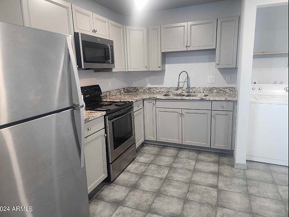 Just over a year old and ready for a tenant to enjoy this well kept home. It features a trendy kitchen with quartz counters, stainless and black appliances, and lovely grey cabinetry. The kitchen is open to the living area. All appliances including washer and dryer included. Both bedrooms have ample space. Covered parking! This is a convenient location to downtown, the I17, I10, 60, and 202 freeways. Water, sewer, and garbage are included in the rent Dryer/ Washer Included. Duplex Home. Rent Includes water, Sewer, Garage Collection, Rental Tax.