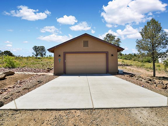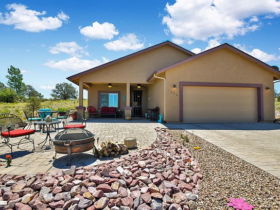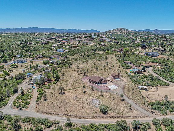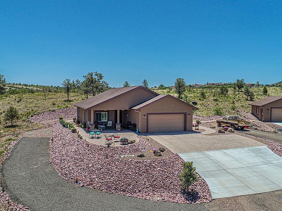 Million dollar views for half the price! Situated on a moderate hill with 100-mile panoramic views. The setting offers a rural feel yet is only minutes from downtown Prescott, shopping & restaurants. This 1544 sf, single story, 3BD/2BA ''almost new'' home is perfectly sized. 2-car attached and 25x30 insulated detached garage provides room for 4-cars, motorized toys, workshop or...? Large 4.66 acre lot is moderately sloped with plenty of room to add horses. Home is well constructed with matching granite counters, wood doors, vaulted ceilings, gas fireplace and wood look tile flooring throughout. Excellent producing well can serve livestock, trees, gardens, etc. No HOA. This home is darling and a must see!