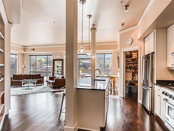 Luxury Living in one of Golden's most coveted penthouses. Penthouse 2 offers dramatic panoramic views in the heart of downtown Golden. Walk to shops, Restaurant's, Wine Bar and more. The Penthouse opens up with 3 entrances to the expansive 1200 SF patio, inviting the outdoors in. Master suite features a 4 piece bath, large walk in closet. The two bedrooms are ensuites separated. The Gourmet kitchen offers a walk in pantry, high end appliances that includes a Viking Six Burner Stove, w/Oven. There is a large dining area off the kitchen. While all main areas enjoy the natural light from the multiple slider doors and windows. The Study is comfortable and functional with tons of built in cabinets. Two parking spots and storage in secure garage. PICTURES ARE SEVERAL YEARS OLD. DIFFERENT FURNISHINGS.