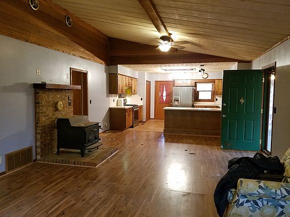 Cedar cabin on over 7 acres of pasture; woods; and lake. 2 bed, 2 bath house has a metal roof; Rhino Shield paint (look it up!) porch, and built in grill on deck. . It has new fixtures and features wood burning fireplace with forced heat into the bedrooms. The 1280 square foot home has an open den/kitchen floor plan and a 1280 sf concrete basemen w/garage door entry and built in storage. Another 5+ acres next door (with home) also available.