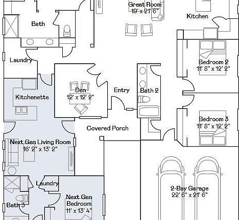 Showcasing Lennar's Next Gen design, this single-level home features an attached private suite with its own entrance, living room, kitchenette, bedroom, bathroom and garage. The main home offers a den off the entry, an open living area and two bedrooms, including the lavish owner's suite with a spa-inspired bathroom and walk-in closet. This home has our Upgraded Kitchen featuring Maple Cabinets, White Quartz Countertops, Luxury Bathrooms where you will find matching Quartz Countertops, & our Luxury Flooring package with tile throughout the home, leaving carpet in the bedrooms! This home includes Wifi heat mapping (engineering), eero Pro 6-mesh wifi system, Ring Video Doorbell Pro, Smart thermostat, Level Bolt - the invisible smart lock and more!