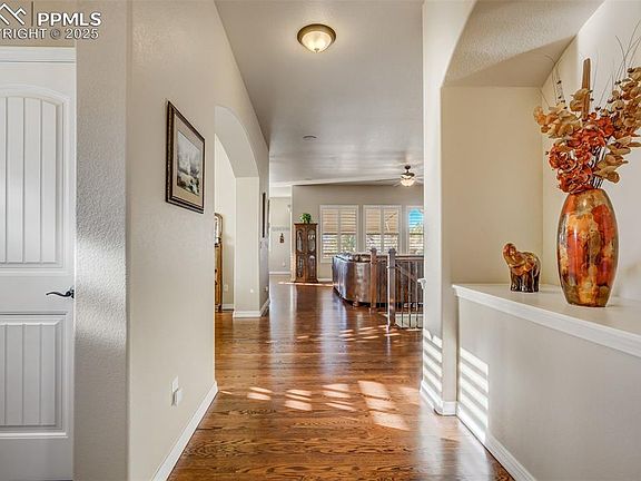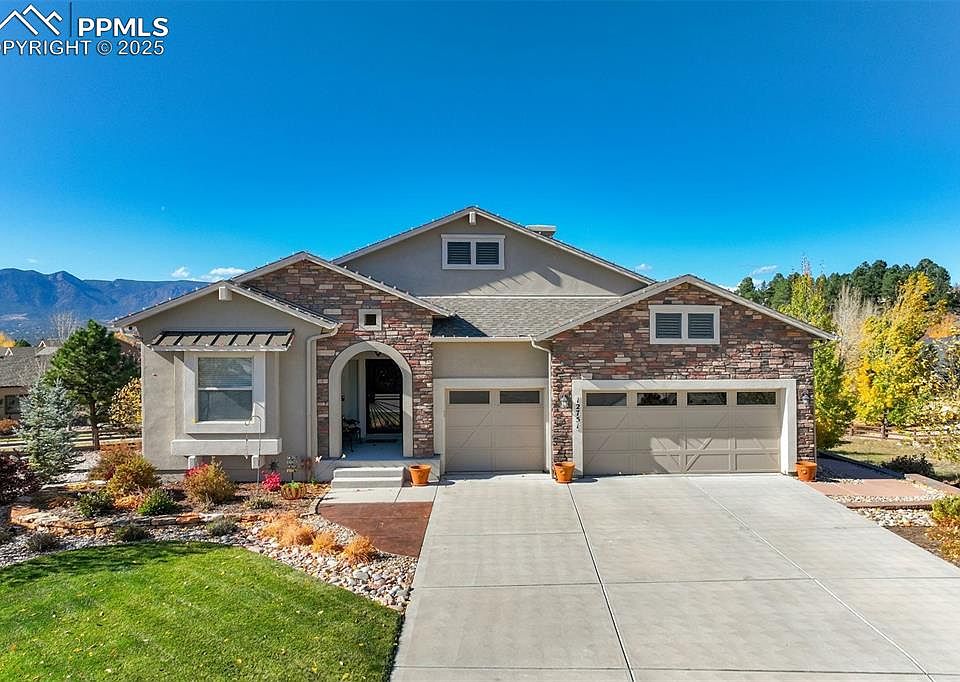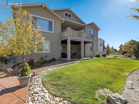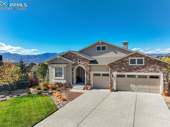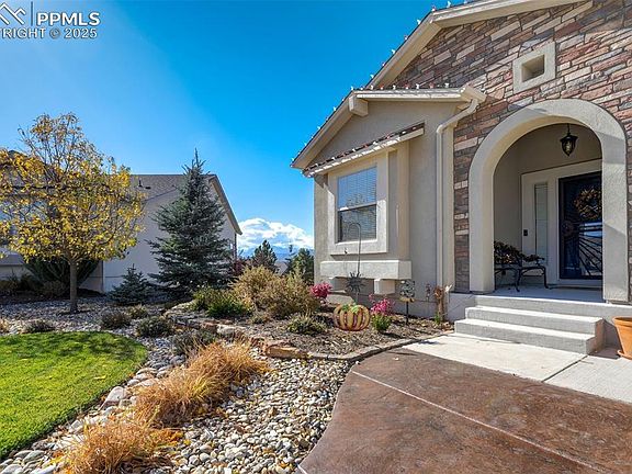 VIEWS! Nestled in a tranquil cul-de-sac on a beautiful 1/2 acre lot in Flying Horse, this dream home provides incredible elegance and stunning panoramic views! Picturesque windows illuminate the space with natural light and feature ever changing Colorado landscapes! The main floor is a seamless open floor plan with beautiful hardwood floors and views from almost every window! Abundant windows with natural light, frame the picturesque surroundings. The gourmet kitchen, a chef's delight, showcases Kitchen Aide appliances including double oven/convection oven, extended counters, gorgeous backsplash and counters, and a Butler's pantry. The oversized island and eat-in nook along with a formal dining room are ideal! Revel in entertaining on the oversized covered deck with gas plumbing, lights/fans, speakers, and an electric awning & VIEWS! Main level living with 2 bedrooms! The primary suite is a retreat with a large picture window and deck access. The spa-like main bath boasts a double vanity, a large spa tub, and a dual-headed shower with bench. The spacious walk-out basement with 9" ceilings offers numerous options for use, and a second fireplace along with pre-plumbing for wet bar. Two additional large bedrooms and a bathroom, along with a large unfinished storage space that is pre-plumbed for a junior suite complete the basement. Step into the half acre park-like backyard oasis with gorgeous professional landscaping. There are multiple outdoor living areas including covered patio and the yard is fenced in and a walking path is directly behind! So many magnificent details such as 2 cozy stone fireplaces with blowers, and NEW custom plantation shutters on the main level! Located in Desirable Academy School District 20's IB Discovery Canyon Campus K-12. Conveniently located with easy access to entertainment, restaurants, and healthcare, USAFA, Denver, Monument, and COS. Membership to Flying Horse resort and club is available, completing the luxurious lifestyle!
