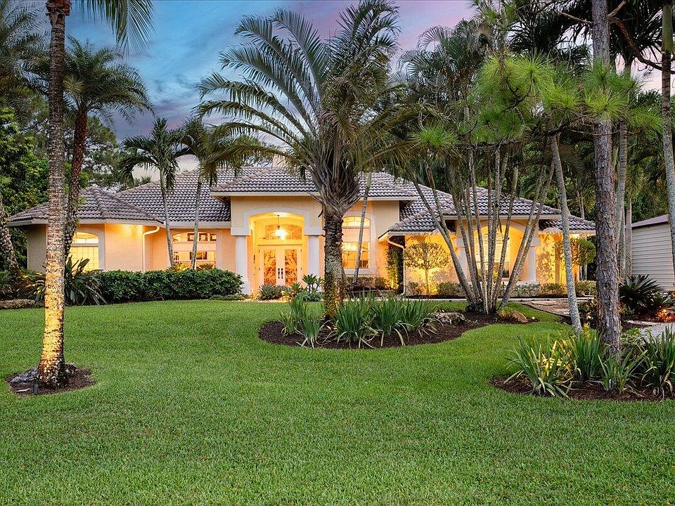 This charming three-bedroom, three-bath home plus a den radiates warmth with its inviting facade. Set on 1.31 acres of high and dry land, it features lush tropical landscaping and a fenced backyard adorned with fruit trees and ample parking for toys. The fully furnished interior boasts crown molding, a gourmet kitchen with soft-close cabinets, integrated appliances, granite countertops, and a 36'' induction cooktop. Additional highlights include a wood-burning fireplace, porcelain tiles, travertine in the bathrooms, and a standout 38 ft custom pool with a jacuzzi and rock waterfall. The outdoor space includes a Tiki Hut with a TV and bar. A detached 1,200 sq ft garage offers three car lifts 6,000LBS each, insulated walls, 220-volt wiring, and its own electrical panel for added convenience