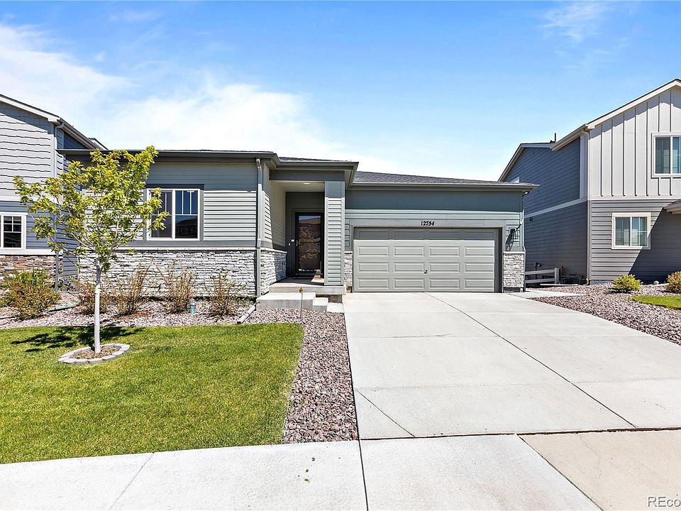 Beautiful new ranch style home on a cul-de-sac, built in 2021. This home rests in the brand new Anthology subdivision in Parker. The spacious kitchen features white cabinets, quartz countertops, huge center island, as well as stainless appliances including a gas range and dual oven. This is an open floor plan featuring lots of natural light, a living room fireplace, 3 carpeted bedrooms and 2 full baths. The large primary suite has a spacious closet and luxury walk in shower. Two additional main floor bedrooms allow for a growing family, office, or home gym. Both bathrooms and the kitchen feature upgraded brushed nickel hardware. This home has a massive garden level basement ready to be finished. The home has a beautifully landscaped back yard with lots of grass and concrete patio backing to open space with no backyard neighbors. There are several parks and open spaces within a short walk of the property, as well as the community pool and clubhouse. The home is conveniently located within walking distance to the neighborhood school and is a short drive to downtown Parker and I25. This is a beautiful new home with excellent views, back yard privacy, and room to grow!