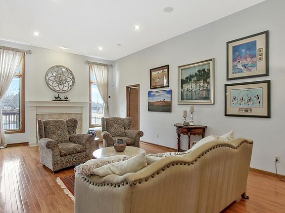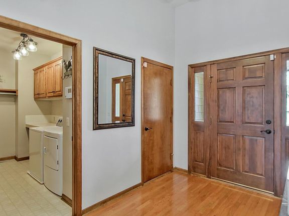 Exquisite Patio Home with a lake view! The moment you walk in you'll notice the dramatic tall ceilings and wood floors that add spaciousness to the living room, dining and sunroom. Shows beautifully! A gorgeous upgraded white kitchen boasts granite counters, a new refrigerator and dishwasher and a double oven and induction range top. Enjoy lovely lake views as you relax in the cozy window lined sunroom. A large master suite with bay window overlooking the lake, a separate main floor laundry, another full bath and a second office-bedroom make this first floor of the home so convenient and spectacular. Walk down the outside low rise ergonomic steps with landing (installed 2022) from the sun room to unwind on the large concrete patio surrounded by a park like setting on the lake. Sprinkler system is installed for the full yard with controller. Downstairs a very lovely family room with gas fireplace with a heatilator circulation fan, a huge wet bar, plus one bedroom, a bonus room with built-in library shelves, full bath, and lots of storage provide extra space for friends and relatives to visit. Two car garage also has new ergonomic stairs with landing from house to garage and new garage door opener. The CertainTeed Class 4 Impact Resistant Composition roof qualifies for insurance discounts with most companies. HOA dues include trash removal, snow removal, and comprehensive yard maintenance (mowing, aerating, fertilizing, weed control). If you are looking for a low maintenance patio home, this is perfect for you!