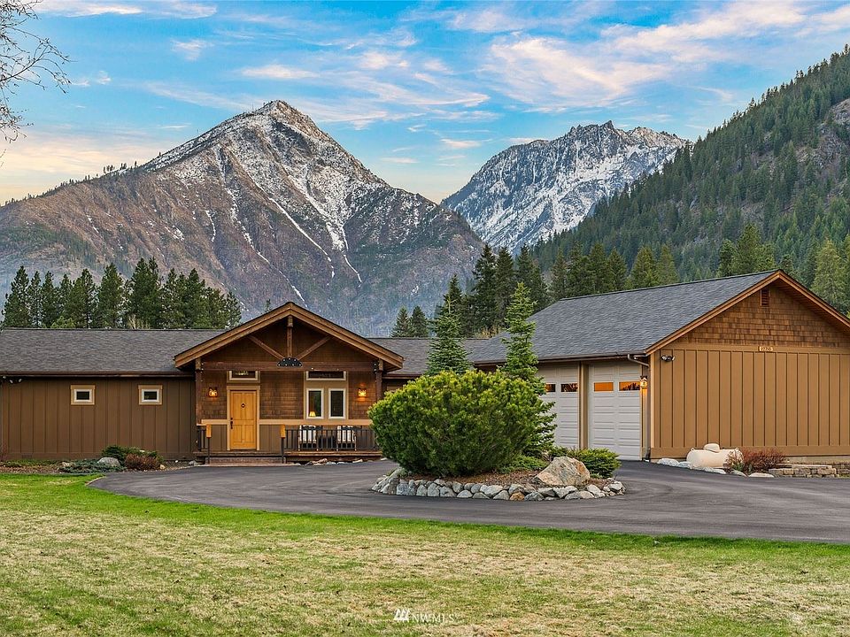 Mountain Living & Gorgeous Enchantment views from this Zimmermann built Rambler on Shore Street. Thoughtfully designed and well maintained by the original owner, discover an open concept kitchen, living & dining room with gas fireplace. Solid fir doors, hickory hardwoods, hickory custom cabinets and a sunlit master suite with fireplace that offers access to the covered deck taking advantage of the mountain views. Heated floors, tile shower & soaking tub in master bath. Easy access to the Wenatchee River and Icicle Ridge Ridge Trailhead, 2 miles from Leavenworth. Oversized 3 car garage, irrigation, auto sprinklers & paved driveway.