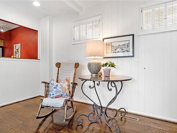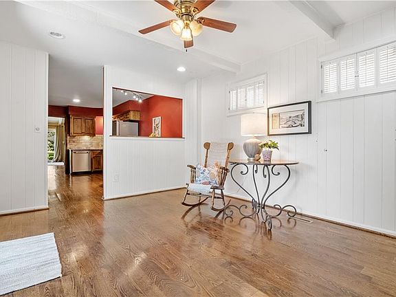 The home features a beautifully updated kitchen with custom cabinets, granite counters, and hardwood floors, open to the den/office and flowing seamlessly into the Great Room and dining area. The Great Room impresses with gorgeous hardwood floors, a vaulted ceiling with exposed beams, a ceiling fan, and a cozy fireplace, all overlooking the backyard, patio, and the golf course.