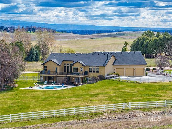 Nestled on nearly 1.5 acres in Hillsdale Estates, this spacious home offers an idyllic setting with sunset views and no rear neighbors. Designed for indoor and outdoor living with inground pool, backyard access to BLM trails for horses or ATVs, multiple deck/patio spaces, and a floor plan built for entertaining. Gourmet kitchen has double ovens, a new gas range and offers formal, informal and al fresco dining options. Flexible living spaces with main floor primary suite, second bedroom and sunlit sitting room that can double as a home office. Downstairs offers 4 large bedrooms, 2 bathrooms, exercise/craft room, large rec room with cozy fireplace and patio access to the pool. An upstairs bonus room offers even more options. Great curb appeal with the garage at the rear of the home and a circular drive for guest parking. Recent updates include newly refinished tan oak wood floors, fresh paint and updated carpeting. Rare opportunity to keep horses on the lot or at the community equestrian center.