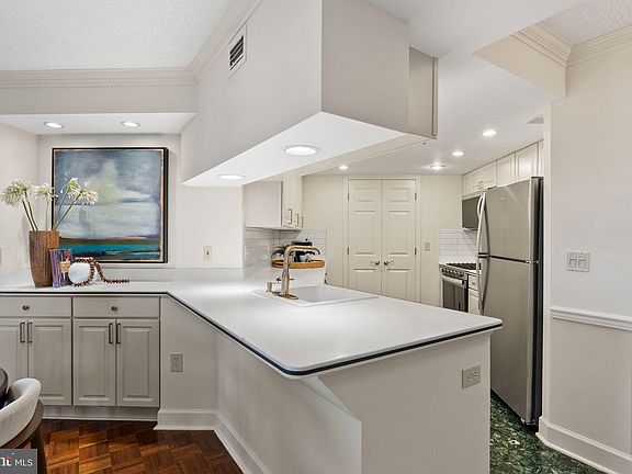 Rarely available 2-bedroom, 2-bath condo on a high floor in The Williamsburg with stunning panoramic southwest views of the Potomac River, Alexandria skyline, and Air Force Memorial—a daily vista that never gets old. This move-in ready gem features fresh paint throughout, brand new stainless steel appliances, newly installed carpet in both large bedrooms, and elegant parquet floors flowing through the dining and living areas. The thoughtful layout maximizes space and light with two side-by-side windows framing those incredible views, while marble tile elevates both bathrooms and kitchen. Crown moldings and chair railings add architectural sophistication, complemented by a cozy gas fireplace for winter evenings. Two private balconies extend your living space—one includes bonus storage closet—while in-unit washer/dryer and walk-in closets handle daily conveniences. Two garage spaces provide rare luxury, with additional storage room for all your gear. Building amenities deliver resort-style living: heated pool, state-of-the-art fitness center, community room, game room, and an active social calendar for those who want to connect, plus professional onsite management. The location strikes that perfect balance—nestled on a quiet dead-end street yet in the heart of Courthouse's energy, steps from Metro, Whole Foods, restaurants, and everything that makes Arlington living so coveted. With upcoming common area renovations adding even more value, this sophisticated sanctuary offers the ideal blend of panoramic beauty, practical luxury, and urban convenience. Condo fees include water, sewer, and trash. Won't last - make your showing appointment today!