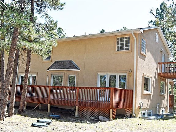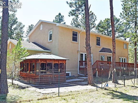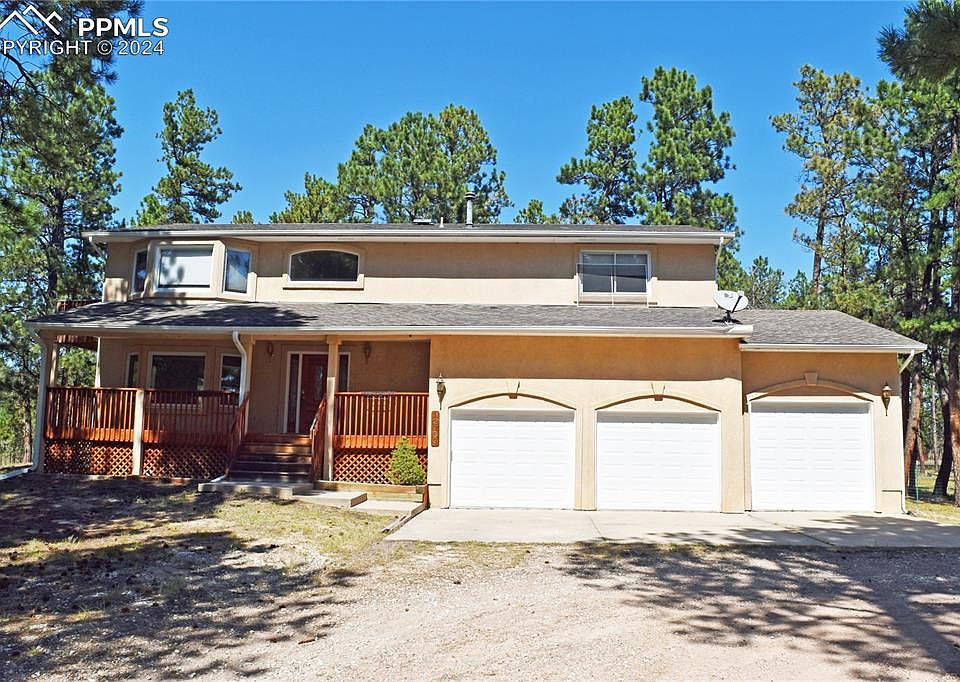 Privacy in the lovely pines, backing to huge open space with County trail system! Stucco 2-story with full basement, 5 BR, 4 BT, 3-car garage with shop space and storage. Main level: huge kitchen/nook & family room with real wood floors and gas fireplace with stone hearth; separate dining room and living room; half-bath; coat closet; 10x40 rear deck and 8x30 covered front porch. Upper level: huge primary suite with separate small deck, 5-piece bath with jetted corner tub, twin vanities, shower and walk-in closet; laundry room (washer & dryer included); 3 bedrooms; full bath and storage closets. Basement: large family room with gas fireplace, bookshelves; kitchenette; large bedroom with walk-in closet; and mechanical/storage room with storage shelves. Outside is a separate enclosure with a hot tub for your soaking pleasure. Fenced dog yard completes the improvements.