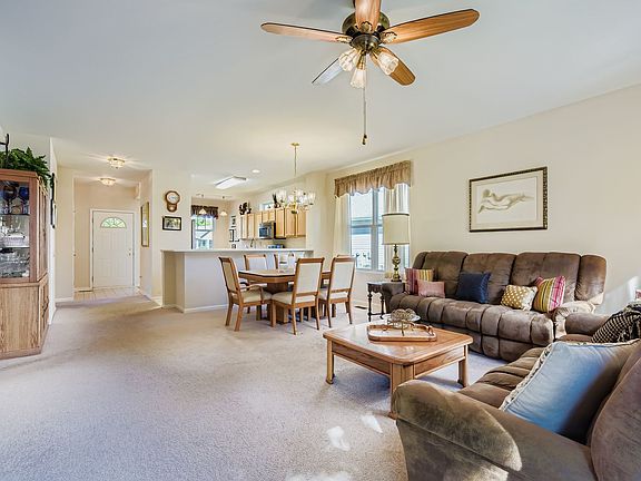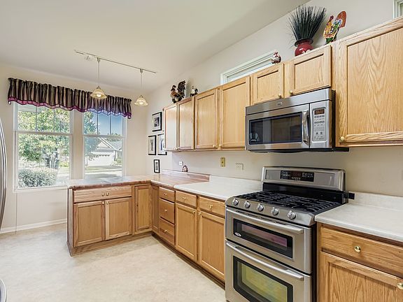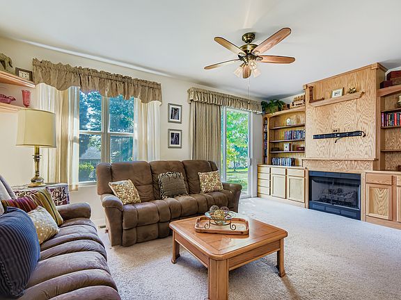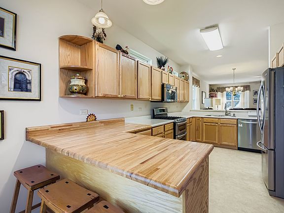 Welcome to resort-style retirement living in Del Webb Sun City Huntley, a 55+ active adult community. This cozy 2 bedroom, 2 bath home invites you in with an open, airy layout designed for both comfort and convenience. The kitchen shines with a custom-made butcher block counter and seating, added cabinetry for storage, stainless steel appliances, and a spacious pantry. The adjoining family room features a fireplace with remote gas logs (or the option for wood-burning), plus a handcrafted oak entertainment center that stays with the home. Step outside to your brick patio with a built-in gas hookup, ideal for grilling and enjoying the peaceful surroundings. The primary suite offers a thoughtful closet addition and private bath, while the second bedroom and full bath provide flexibility for guests or office space. Practical updates include a 2-car heated garage with shelving, concrete driveway, furnace/AC (4 yrs), water heater (4 yrs), water softener (4 yrs) and roof (3 yrs) for true peace of mind. Life in Del Webb means more than a home-it's a community: Whisper Creek Golf Course, fitness centers, indoor/outdoor pools, 80+ clubs, concerts, walking trails, on-site dining, and endless opportunities for active, social retirement living.
