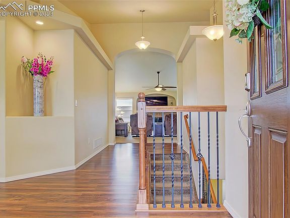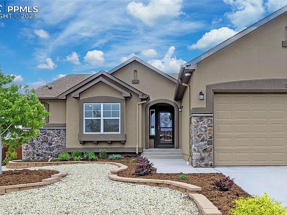 Welcome Home to this Stunning home in Meridian Ranch! This Raintree Model has all the Options and some fancy inclusions! Beautiful Stucco and Stone exterior and Xeriscaped Front yard with drip system is great for low maintenance. As you enter the home, you are greeted with a picturesque foyer, LVP flooring, an office to the left with French Doors followed by a Junior Suite with Private full bath. As you make your way towards the living room, you will notice a hall with Guest bath and entry into the Gourmet Kitchen. The Kitchen features Stainless Steel Appliances, Gas Range topped Double Oven, Granite Counters, Island, Pantry, room for a breakfast table and an ample amount of cabinets. The Dining Room and Living area, though an open floorplan, are separated with wonderful architectural elements. The Primary Suite is located near the living room. This Suite has a large bedroom, 5-piece bath with large shower and spacious walk-in closet. The Fully Finished basement is an Entertainer's Dream! A massive Storage Closet can be for an extended pantry, game closet, or the perfect place to hide when playing hide-n-seek! The Pool table is the Center of attention in the first part of the recreation room...and it stays! The next part of the room is currently a workout center, but could be used in oh so many ways. Enter through the Double Doors at the end of the room into your own personal movie theater! Currently the HUGE Mounted TV stays in the theater. The other pieces (Speakers, chairs, console, receiver) are available for purchase/negotiable. The basement also has two additional bedrooms, a full bath and a second laundry with included 2nd washer and dryer set. The back yard is a great place to gather for a barbeque with a large grassy area, storage shed, expansive patio and included natural gas grill! Yard is fully fenced for your privacy and has access gates on both sides. Easy Access to all the Military bases and everything else the Springs has to offer.
