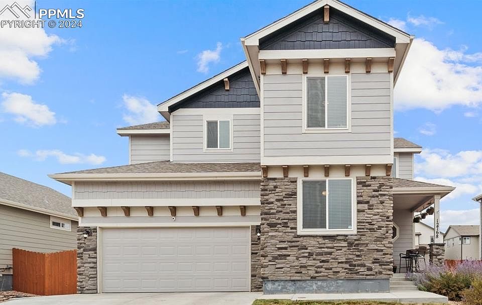 Exceptionally elegant two-story home with a fully finished basement in Peyton! Located in the sought-after community of Meridian Ranch, this spacious five-bedroom residence captivates with rustic stacked stone detailing, manicured landscaping, and a charming covered front porch, offering excellent curb appeal. Designed for modern living, the luminous interior impresses with an open floor plan, a contemporary color scheme, beautiful wood flooring, a large living room, and a chic chef’s kitchen featuring stainless steel appliances, granite countertops, richly toned 42" cabinetry, a pantry, breakfast bar, and a dining area. Perfect for entertaining, the fully fenced backyard boasts a wide concrete patio with a pergola and low-maintenance xeriscape with turf and concrete for extra outdoor living space. The generously sized primary bedroom offers tray ceilings, ample closet space, and a luxurious en suite with a soaking tub, dual sinks, and a separate shower. Three additional bedrooms, along with the laundry room, are conveniently located on the upper floor. The finished basement serves as the ultimate man cave/bar area, complete with a living space, full bathroom, and an additional bedroom. Tons of storage space throughout! Other features include a 3-car tandem garage with extra storage, raised vanities in all bathrooms, bullnose corners, and a humidifier. Enjoy access to the community recreation center, and proximity to shopping, schools, golf courses, dining, and more! Schedule your tour today!