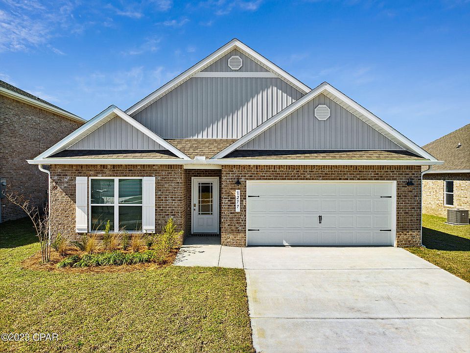 Andrews Park is centrally located off 389 in the very desirable area off Lynn Haven. Our Rhett floorplan is all brick, 4-bedroom 2-bath, it is an open concept floor plan, with a boasting 1,835 sq.ft. The Rhett floorplan has upgraded finishes throughout. You will find 9-foot ceilings with 10-foot trays and beautiful crown molding. The Rhett also has LVP flooring, granite countertops, a large kitchen island with cabinetry on both sides underneath and brushed nickel hardware. This floorplan has energy efficient windows to allow lots of beautiful natural light. The primary bathroom has a beautiful garden tub, perfect for relaxing, and a spacious walk in shower with a glass enclosure. All of these homes come with Deako lighting and Safe Haven smart home systems. Andrews Park homes feature irrigation systems with reclaimed water to help minimize your water expenses. All homes come with a landscaping and sod package as well as gutters. This particular home comes with our move in package: window blinds, Whirlpool appliances including refrigerator, washer and dryer.