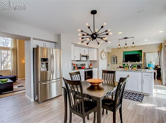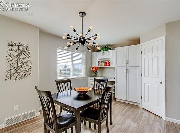 Must see Trail Ridge home with stunning panoramic views of the front range and Pikes Peak from all rear windows. New bamboo engineered hardwood floors and baseboards on the entire main level. October 2018 remodeled eat-in kitchen features new white shaker style cabinets, new stainless steel appliances, modern light fixtures, a spacious walk-in pantry, granite counter tops, built-in work space/desk, and the large island boasts seating space and a new sink/faucet. Open floor plan perfect for hosting! Family room features 17' ceilings, stylish stone surround on the gas fireplace, over sized windows for ample natural light, and new ceiling fan. Main level office/playroom with French doors, as well as a 17' tall formal living/dining space. Updated powder room with granite counter top and waterfall faucet. Vaulted ceiling in the master bedroom with large walk in closet and five piece bath. Two additional upstairs bedrooms with large shared bathroom. Conveniently located upper level laundry. Newer paint and 2.5"blinds on the main and upper levels. Completely finished garden level basement including a large rec room with wet bar, a bedroom, and a flex space. 11'x16' rear deck. Central AC. Close proximity to parks, trails, Davinci Elementary, District 20 schools, Air Force Academy and I-25 access.