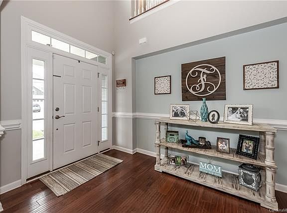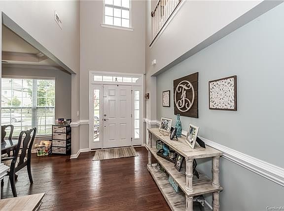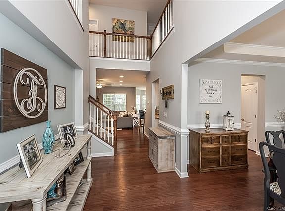 Beautifully finished home with scraped hardwood floors, 2" blinds, designer paint, guest room on the main floor w/ full bath, "smart" light switches, open floor plan with tons of natural light! Enter the 2-sty foyer, dining room with tray ceiling and moulding to the right. Gleaming hardwood floors! Kitchen w/ 5-burner gas range, stainless steel appliances, pendant lighting over the bar, granite counters. Great room w/ ceiling fan & corner gas log fireplace. Upstairs offers a large open loft plus two guest rooms sharing a hall bath with dual sink granite-top vanity, tile flooring. Owner's suite has tray ceiling w/ ceiling fan, walk-in closet, private bath with lg shower w/ dual heads, soaking tub w/ tile surround, and dual sink vanity! Outside the patio overlooks a spacious level yard backing to trees for privacy. Swim community. Convenient to Concord Mills & Christenbury Corners for shopping and restaurants. Cox Mill high school!!