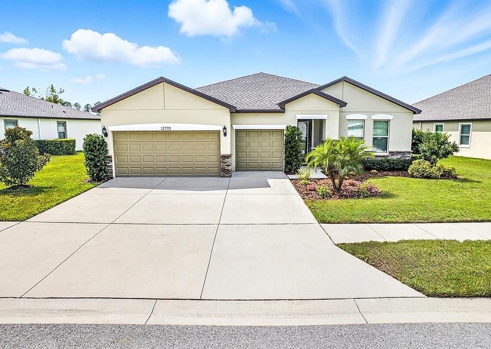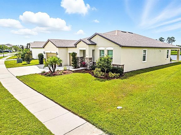 One or more photo(s) has been virtually staged. Welcome home to this stunningly elegant and immaculately maintained Centex Homes Palm Model, built in 2020 and situated on a spacious, just under ¼-acre premium pond homesite in the highly desirable community of Talavera! Boasting 2,484 square feet of living space, this 4-bedroom with a 3-car garage home features a thoughtfully designed layout and custom upgrades throughout, beginning with a grand trussed front entrance with stone elevation and glass inlay that opens to a spacious foyer with access to a flex room—ideal for a home office, den, or bonus space. The formal dining room flows effortlessly into the open-concept main living area, where the upgraded kitchen impresses with stone countertops, staggered cabinetry with crown molding, tile backsplash, pendant lighting, stainless steel appliances, an oversized eat-in island with large single basin sink, separate café area, and large walk-in pantry. Additional highlights include upgraded baseboards, neutral paint, 8-foot doorways, and tile flooring throughout the main living areas. The oversized owner’s suite offers direct pond views, dual closets, and a beautifully appointed en suite bathroom featuring a large step-in shower with upgraded shower head, dual vanities, linen closet, private water closet, and glass shower enclosure. The additional bedrooms are generously sized, positioned in a true split-floor plan for privacy near a large bathroom and extra storage closet. Bathroom 2 features its own private water room with pocket door and tub—ideal for guests or multigenerational living. A spacious interior laundry room with utility sink provides convenience with corridor access. Outdoors, enjoy a true retreat on the oversized trussed lanai overlooking one of Talavera’s largest ponds—perfect for entertaining or relaxing in privacy. Additional upgrades include an in-floor outlet in the living room, water softener, rack storage in the garage, and an additional window. Located in the resort-style community of Talavera, residents enjoy a zero-entry pool, splash pad, clubhouse, cabanas, tennis and basketball courts, playground, and weekend food trucks, with easy access to US-41, SR-52, and the Suncoast Parkway—making this exceptional home the perfect blend of size, style, lifestyle, and location. Schedule your private showing today—this one won’t last long!