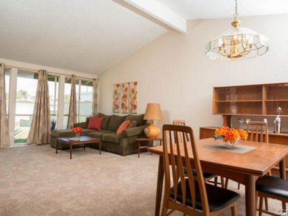 This sunlit, Mid-Century Modern "Estates Model" is the most highly sought after floor plan in the community. Light, Bright and Airy with Cathedral Ceilings and walls of windows. Home has been well cared for, with improvements including some scraped ceilings, recessed lighting and dimmers. New Roof is between 4-6 years old. Decorated with designer colors this pleasant home retains the original flavor of the time period. Ideal location on interior street and proximity to Library, Restaurants and Shopping of Rossmoor Center. Distinguished Rossmoor Schools.