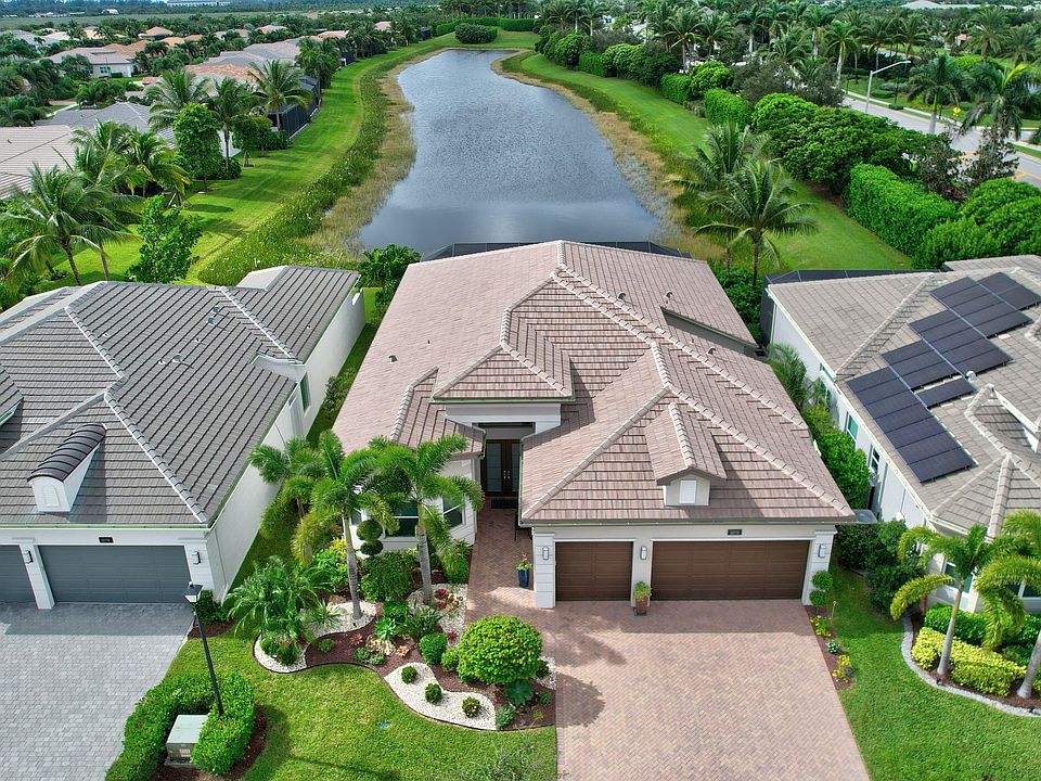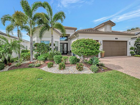 Rare chance to own a magnificent move in ready upgraded home complete with impact glass on one of the best private water lots in the community! True pride of ownership prevails in this professionally decorated Piazza model on fabulous long waterfront lot featuring 3 bedrooms,3 bath plus den/office, two outdoor patio areas + 3 car garage. Extras include state of the art lighting, fitted closets, central vacuum system, custom built ins, custom barn doors & window treatments, extended COVERED patio roof line with extended screen enclosure, your very own upgraded jetted hot tub & motorized storm smart screens to protect your outdoor furnishings from wind rain etc. Enjoy this great home for entertaining in-between walking to 33000 sq ft clubhouse to cafe, gym, tennis, pickleball, clubs, shows