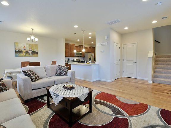 You'll love this exquisite two story end unit townhouse with captivating landscaping and an enlarged patio perfect for summer BBQs* This three bedroom three bathroom unit with a two stall garage will give you 1674 sq ft of generous space to move about* This unit features a spacious master bedroom with two large walk-in closets, upstairs loft, and cozy fireplace perfect for the cold winters* The kitchen has upgraded 42" cabinets, recessed lighting, stainless steel appliances, and hardwood floor throughout the main level* This home has the longest driveway in the complex perfect for accommodating a large family or your guests* The unit is two years old and in near new condition* No monthly HOA, it is included in the taxes* Close to shopping, parks and trails*