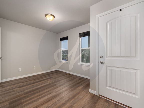 The main level features elegant laminate hardwood flooring, a front office with half bath, and an open-concept living area flooded with natural light. The kitchen boasts stainless steel appliances, quartz countertops, a center island, and dining space overlooking the expansive backyard. Upstairs, three generous bedrooms share a full bath, while the primary suite impresses with vaulted ceilings, a 5-piece spa bath with soaking tub, and a spacious closet. Convenient upstairs laundry completes the upper level. The fenced backyard includes a built-in fire pit, and the 2-car garage features 240V EV charging. Enjoy resort-style community amenities including a rec center, golf course, pool, fitness center, parks, and trailsall minutes from shopping and dining.