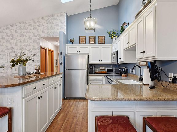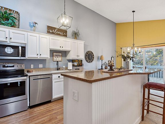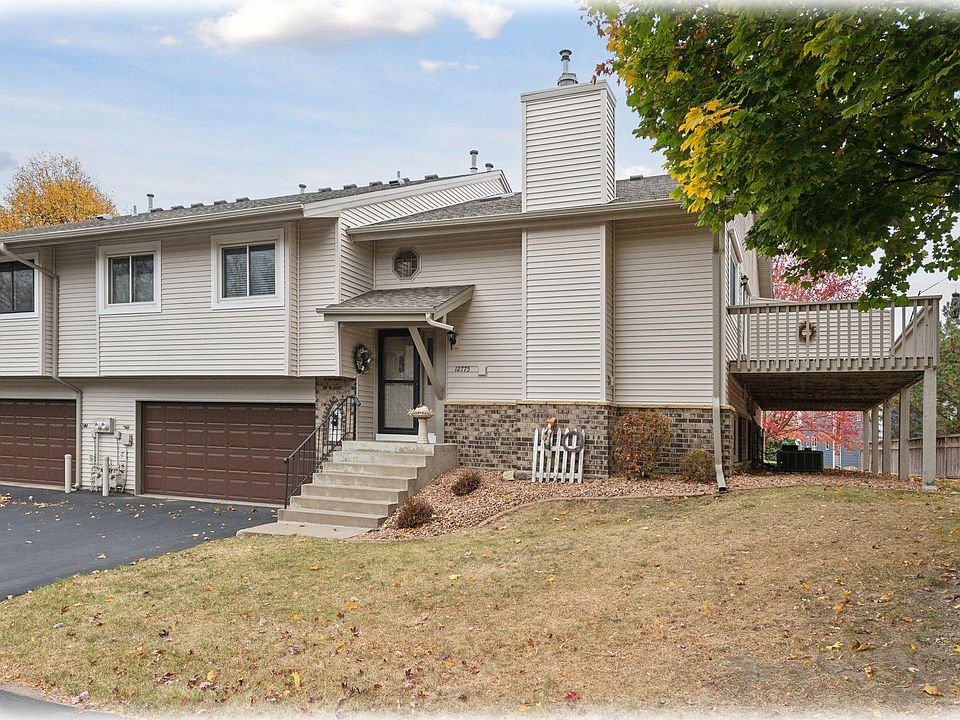 LOCATION LOCATION LOCATION. Nestled in a serene, established neighborhood, this stunning end-unit townhome offers the perfect blend of style, comfort, and convenience! Surrounded by scenic walking trails and just minutes from shopping, community center, Central Park, library, and recreational amenities, this home places the best of the area at your doorstep. Step inside and be welcomed by an open, airy floor plan offering natural light, complete with vaulted ceilings, skylight, and so many fresh updates! The spacious kitchen boasts white cabinetry, sleek countertops, a huge breakfast bar, easy-care flooring and newer stainless steel appliances (still under transferable warranty), this kitchen truly has it all. Enjoy effortless indoor-outdoor flow from the dining area, where sliding glass doors lead to a large, private deck—ideal for your morning coffee or weekend relaxation. The primary bedroom is a peaceful retreat with a generous walk-in closet, a private prep vanity, and convenient walk-through bathroom access. This home is packed with upgrades: new siding, attic insulation, insulated garage doors, countertops/vanity tops, replacement windows/patio door, water softener, programmable thermostat, window treatments/blinds with remote and so much more! Potential for a 3rd bedroom in lower level. Garage with loads of storage space. With every detail attended to, all that’s left is for you to move in to this impeccably maintained home!