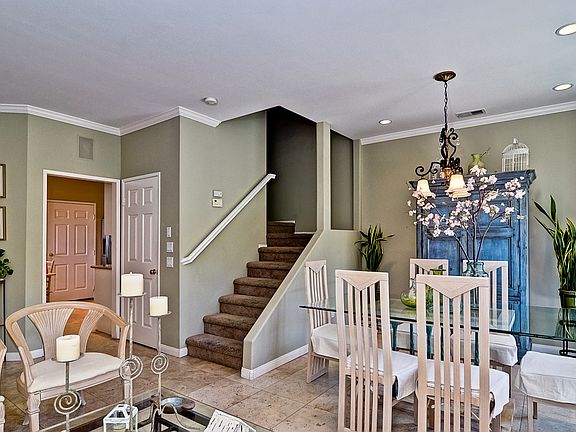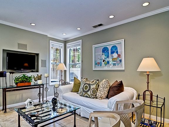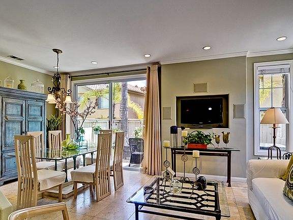 Gorgeous 2 bedroom, 2.5 bath, dual master suite, Montemar townhome. This light and bright end unit is upgraded with high end finishes including the beautifully remodeled dine-in kitchen with custom cabinets, slab granite counters and SS appliances. Crown molding, designer paint, wood framed windows, surround sound and travertine tile flooring complete the main level. Bathrooms feature custom cabinets, slab granite counters, and custom lighting. Enjoy the lovely sunny southwest exposure wrap around patio!