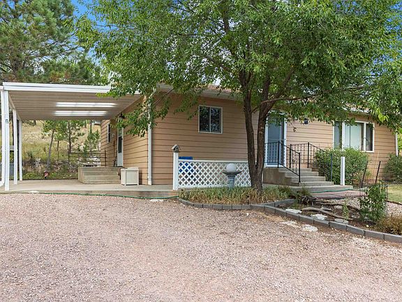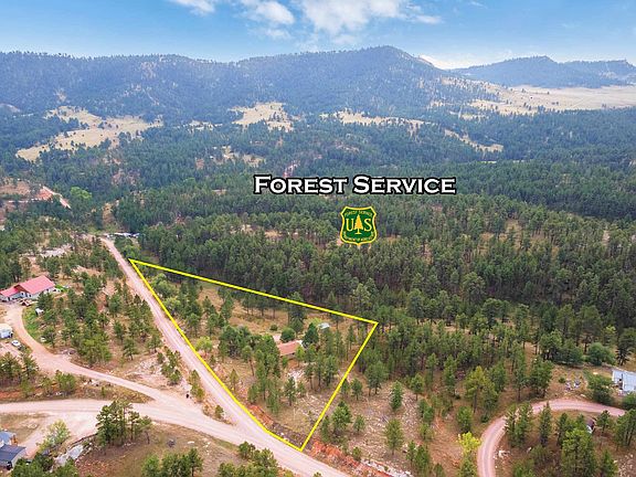 Country property on 2.7 acres and borders forest service. All one level with 2 bedrooms and 2 baths with country kitchen and combined living and dining room. Propane free standing fireplace in living room. Picture window to bring the outdoor view in. Master bedroom has 3/4 bath and walk in closet. Main level bath has tub combo and has a sun tunnel for extra lighting. All electric. Front concrete patio and side concrete patio with pergola . Garden areas, apple and lilac trees. Private well and outside spicket. 14x24 utility shed with metal roof. New exterior paint in 2022. Boundary survey and corners marked in 2022. No covenants but does belong to a road district. Private setting with views in all directions. Truly your black hills paradise with plenty of room for a large shop or accessory dwelling. Well maintained. Hidden jewel with all the flexibility this property offers and the price is right!