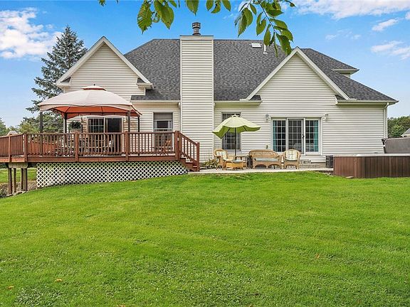Relocating homeowner offers this beautiful home on 4.75 acres with attached garage. A fantastic floor plan with spaces to entertain or just relax and unwind. The covered front porch leads to the foyer and spacious office. The living room has an open staircase, vaulted ceiling & woodburning fireplace! The updated eat in kitchen features breakfast bar, island with prep sink, wine fridge, granite counter tops, plenty of cabinets plus there is a formal dining room. Sliding doors off the kitchen lead to a great deck, patio and hot tub while enjoying views of the wooded and private backyard. The master suite has walk in California closet, spacious bath with double sink, whirlpool tub & separate shower. The open staircase leads to two bedrooms & full bath. The owners added a second garage in 2011 (26x35) that is insulated has a finished upstairs for additional storage. A new roof with architectural shingles 3 years ago. Radiant floor heat and partially finished walkout basement are just a few of the amenities of this wonderful home. Delayed showings begin September 18th after 5 pm.