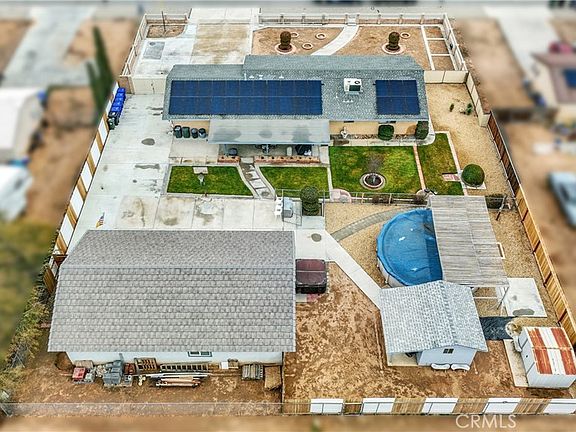 Welcome to this beautiful 3 bedroom and 2 bathrooms move in ready main home with attached oversized 2-car, 441 sq. ft. garage and a separate 1000 sq. ft. DETACHED GARAGE with LIVING AREA. Great curb appeal with desert-scape and front fencing constructed of iron and cinder blocks, providing privacy. Extra-large driveway and RV gate access. The front of the home’s windows has blue glass which cuts down on the heat and keeps the interior cooler. Open concept floorplan flows from kitchen to dining area to large living room with new carpet. The kitchen is equipped with a stove, dishwasher, and microwave, all of which are new. Dining room features new double French doors to back yard. All 3 bedrooms are oversized and have ceiling fans. Master suite includes bath with upgraded cabinets and counter. The new French doors open to an expansive covered patio and built out shed and jacuzzi. The backyard also has a 24-foot round above ground pool, which is approximately 5.5 feet deep and comes with filter, timer, and an oversized pump. The backyard fencing is almost 90% upgraded with vinyl and wood fencing. Approximately 1000 sq. ft. DETACHED GARAGE AND LIVING AREA features a 2-car garage with 220V on one side and 2 bedrooms and a living area on the other. The garage has its own new electric sub-panel. 20-year solar lease to be assumed by buyer.