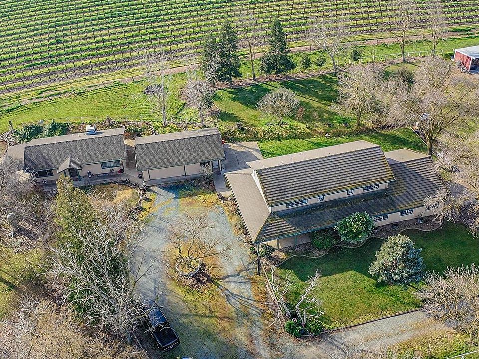 Take a look at this amazing property! Two homes, 20 acres at the end of a private road with vineyard views. You could not find a better setting so close to town for multi generational living. Main home is 4 bedrooms 3 bathrooms 2700 sq ft with a 2 car attached garage. Second home is approximately 984 sq ft. 2 bedrooms 1 bath, with an additional detached 2 car garage which also includes an additional area that could be used for an office or turn it into a studio for additional living space. Property also includes 5 stall barn with a tack room, arena, round pen, chicken coup and also fenced pasture for your livestock. In addition there are 2 pole barns, both with concrete floors, and a pond for your enjoyment. You do not want to miss this exceptional offering. Watch virtual tour for your online showing and then call today!