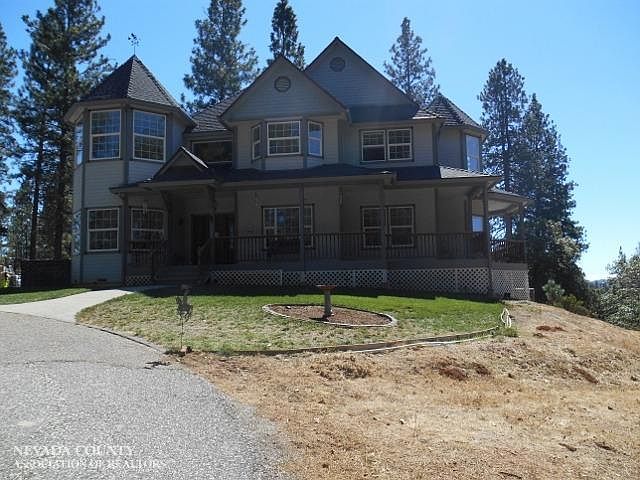 Victorian style home built in 2004 on useable 10 acre lot. Top of the hill with views over the surrounding hills and vineyards. Four bedrooms, two and a half baths with parlor, office, interior laundry in main house. Guest house has small kitchen & living area, two cozy bedrooms and bath. It's attached to a 2 car garage with lots of storage. Two stall plus storage barn and corral is close by. More could be fenced for additional livestock. NID junction box in the corner of the property provides pressurized overflow irrigation water and rushing creek along the side of the parcel. 5 acre Agricultural zoning could allow for a future split. Wraparound decks and stone courtyard provide outdoor entertainment areas with speaker system in and out. This is a gem!