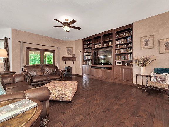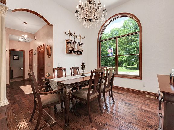 Custom built ranch, nestled on 5.45 Beautiful Acres(7 separate acres available) as you enter, the long concrete drive takes you to this 2650 SQFT 2x6 built home. NEW Roof 7/23 Boasting 3 stall oversized garage with battery back up openers (so no worries if you are out of power) 3Wayne Dalton garage doors. Lion heads greet you at the front door. 3 bdrms (possible 4th), 3 baths, formal living room with built in library, pellet stove sits on marble floor. Brazilian hardwood throughout. Formal dining with an exquisite chandelier 16 foot ceilings, unique textured ceiling & walls, all framed in by beautiful marble powder columns & arch. Chefs kitchen offering copious amounts of custom made cabinets, huge pantry, Island with beautiful corbels, SS APPLIANCES Jenn-Air Gas cook top with Hibachi grill. Eating area looks out upon a wooded area with tons of wildlife, Slate backsplash & floor. Sun filled family room 6ft Pella UV protection windows throughout the home. Expansive laundry room with SS sink cabinets closet & room for a queen size air mattress. 2 large bdrms & bath on this side of home. Move to the master wing which offers a private room with wet bar stem ware rack microwave mini fridge SS sink & cabinets. Cozy man cave/nursery/library/office so many options. Go back through the master to his & hers WIC on each side of hall then into en-suite with a plethora of light his & hers granite vanity with raised bowls on each end of bathroom. Walk in shower with blue tooth fan, low lighting for relaxation. 2 person Bain Ultra AIR tub with heated back rest, pure tranquillity. Enjoy watching the deer, turkeys & turtles around the pond & listening to the wind blowing through the trees on the 24x12 covered patio 2 ceiling fans & 12x12 uncovered patio. 18 sear heat pump propane back up humidifier attached Gas water heater & Kenmore Water softener. RV parking pad with 30 & 50amp outlets. Storm Shelter GREAT LOCATION approximately 7 min to I-44 4 min to HWY 60 7 min to Republic.