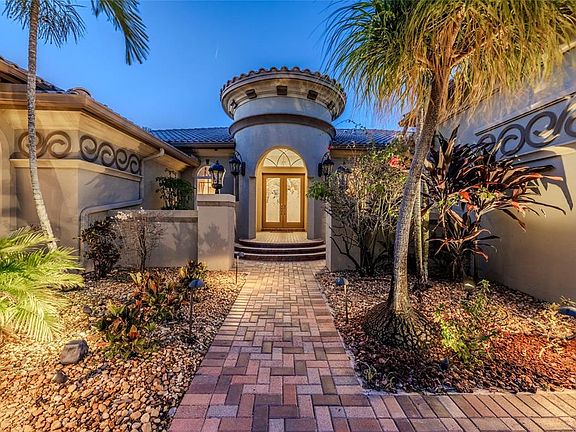 The circular driveway, exquisite elevation & beautiful landscaping only begin to define the outstanding features of this stunning home! Desirable features incl: triple split plan; impact windows & doors; volume ceilings w/crown molding; amazing chef's kitchen w/custom cabinets, pantry closet, natural gas cooktop (also gas hot H2O heater & outdoor grill), granite counters & breakfast bar, built-in s-steel appliances, & breakfast area overlooking water; five bedrooms+office+exercise room/nursery off beautiful MBR; MBA w/whirlpool tub, separate vanities & private bidet & commode; all California Closets; Central Vac (missing hose); GORGEOUS appointments--window treatments & light fixtures; beautiful, saltwater, heated, screen-enclosed pool w/Fastlane swim system; & breathtaking lake views!